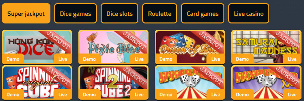 - dice spellen: Diamond Double Wheel, Mystery Chips, Spinning Cube Original, Diamond Jungle…