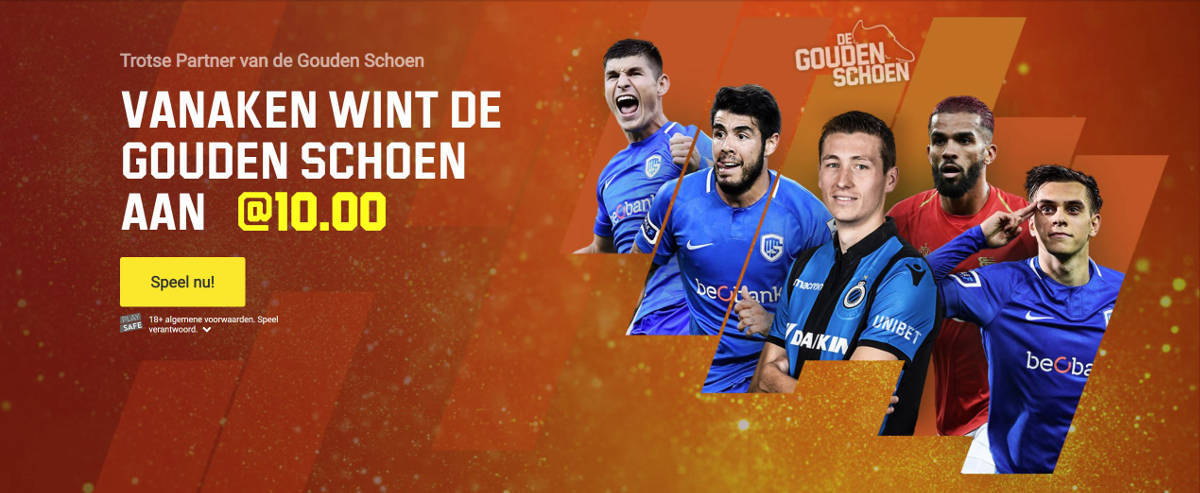 Omdat Unibet zo trots is dat een van de spelers van de ploegen die ze sponsoren kans maakt op de Gouden Schoen, hebben ze beslist om een leuke promotie te organiseren voor al hun nieuwe leden. Nieuwe leden die een weddenschap plaatsen op Hans Vanaken tussen woensdag 26 december 2018 en woensdag 16 januari 2019, krijgen de ongelofelijke quotering van 10.00 voor een overwinning van de Bruggeling. Je moet daarvoor wel al een storting op je spelersrekening uitgevoerd hebben door een van de veilige betalingsmethodes te gebruiken en het moet ten minste een weddenschap van €2 zijn.